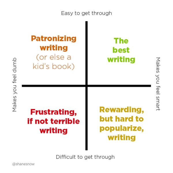 Now, a lot of writing that makes us smarter, better people, is worth reading even though it’s difficult. Most of the textbooks I remember from college were this way. Piketty’s Capital in the 21st Century was this way for me. (Though admittedly I’m not an economist, so it may have been easier for his core audience to jibe.)